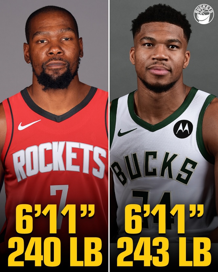 两人均是6‘11(210.82cm)杜兰特240LB(108.862kg)字母哥243LB(110.223kg)
