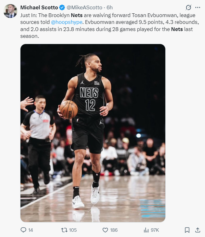 北京时间8月30日,NBA记者迈克尔-斯科特透露,篮网队已经裁掉了双向合同前锋厄沃马的合同,他上赛季在篮网场均23.8分钟,拿到9.5分4.3篮板2助攻。