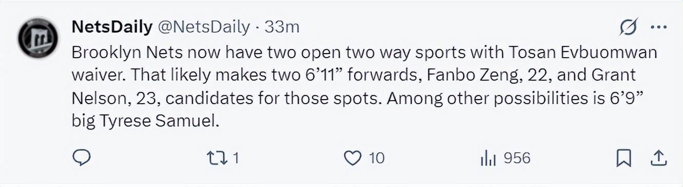 随后篮网媒体NetsDaily写道:篮网裁掉厄沃马后,篮网剩下两个双向名额。身高2.11米的前锋曾凡博、23岁的纳尔逊可能是这两个位置的人选,身高2.06米的内线萨缪尔也有可能是人选之一。